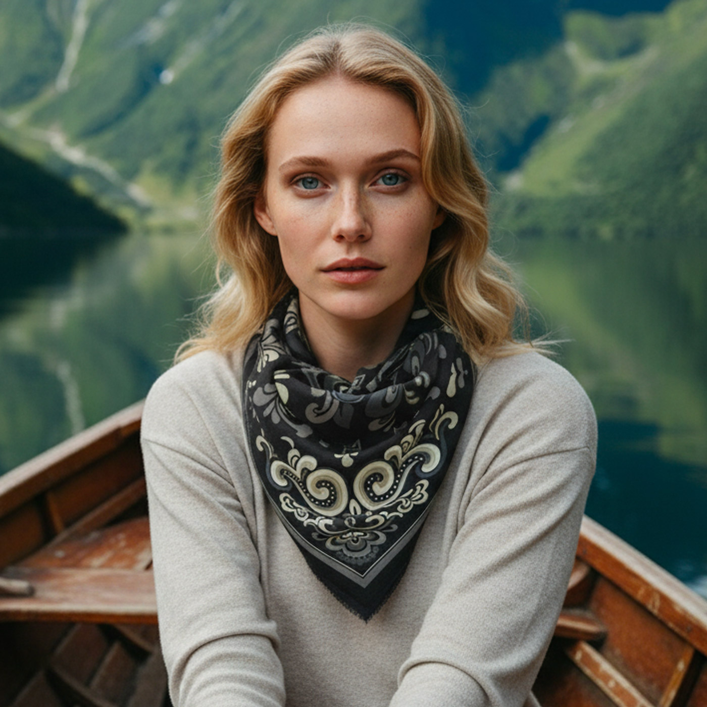 The design is inspired by the intricate floral patterns found in the Telemark bunad, reimagined for timeless, modern wear.